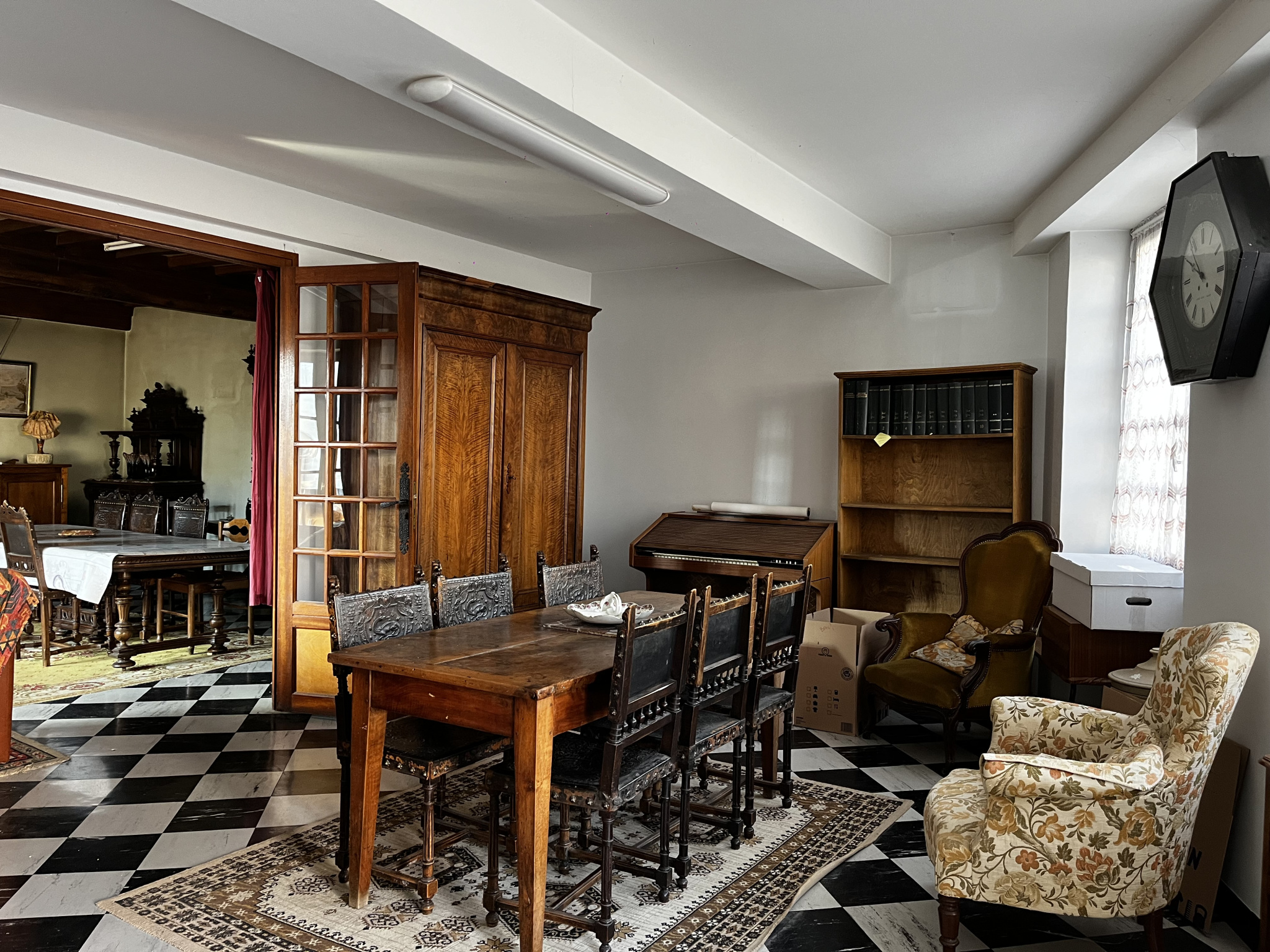 Au premier niveau, on trouve : une entrée de 24 m² (ou salle à manger/bureau), un grand salon de 36 m² avec sa cheminée et son plafond à la française, une cuisine, 3 chambres, une salle d'eau, un WC, un bureau, deux espaces avec lavabos. Une galerie de 30 m² agréablement orientée sud-ouest prolonge toutes ces pièces de vie vers la cour. La moitié de la galerie est habillée de baies vitrées.